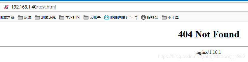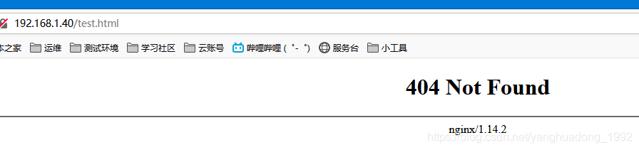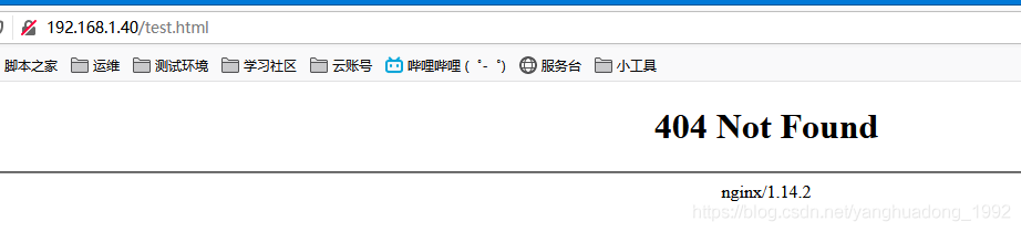 此时不要使用nginx -v命令查看nginx版本, 因为nginx二进制文件已经替换成了1.16.1版本的nginx二进制文件,所以,如果此时使用nginx -v命令查看版本,得到的版本号必定是1.16.1,但是实际上,内存中运行的nginx进程版本仍然是1.14.2,如果你想要确定此刻内存中真正工作的nginx进程的版本号,可以故意访问一个不存在的资源,默认情况下,nginx的404页面中会显示nginx进程的版本号(除非你修改了相关设置),如下图所示,我故意访问了一个不存在的资源,可以看出,当前内存中的nginx版本号仍然是1.14.2