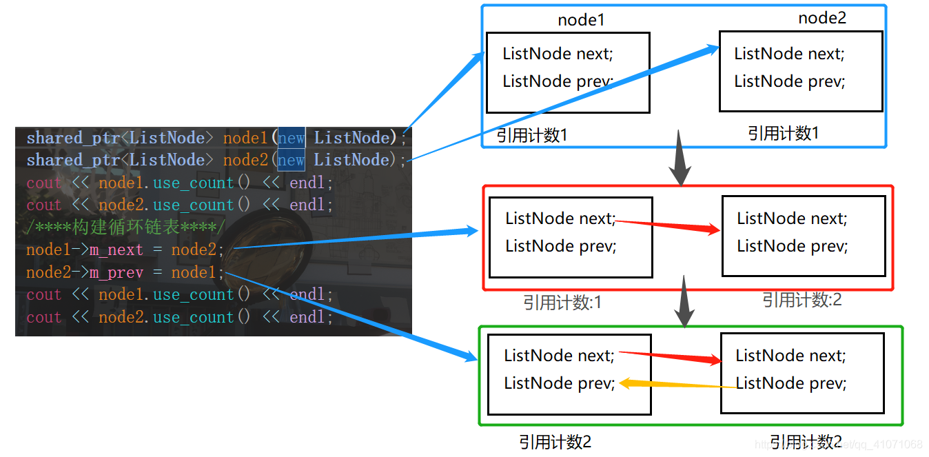 引用计数变为1.此时node1的资源由node2的prev管理, node2的资源由node1的next管理. 要释放所管理资源就要释放 node2的
