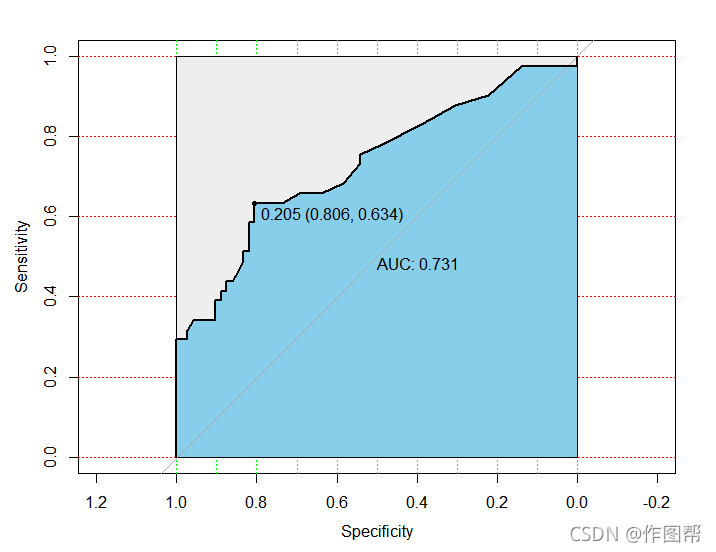 plot(rocobj1, print.auc=TRUE, auc.polygon=TRUE,