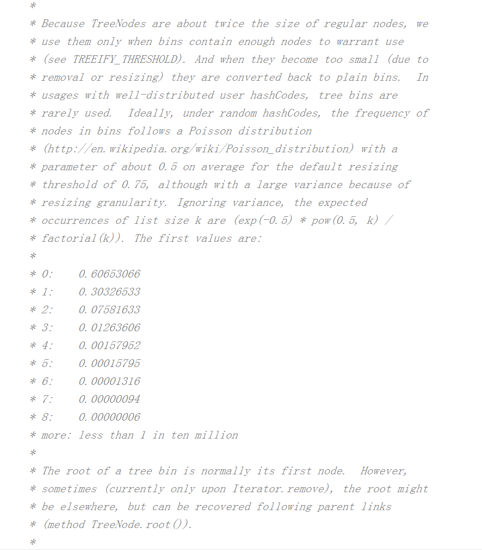 通过源码我们得知 HashMap源码作者通过泊松分布算出,当桶中结点个数为8时,出现的几率是亿分之6的,因此常见的情况是桶中个数小于8的情况,此时链表的查询性能和红黑树相差不多,因为转化为树还需要时间和空间,所以此时没有转化成树的必要。