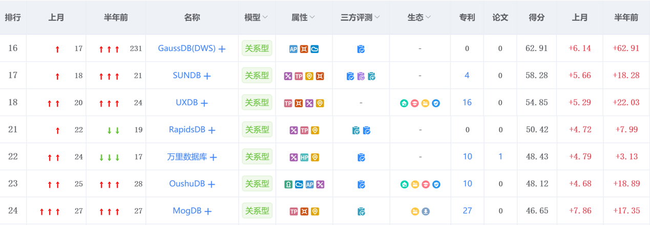 墨天轮本月排行榜上有个奇妙现象,榜单上第16名-第24名之间竞争激烈,动向频繁。在这一个赛道中,超七成的数据库较上月的排名都有所上升,这说明这一个赛场的数据库“厚积分秒之功,始得一鸣惊人”。