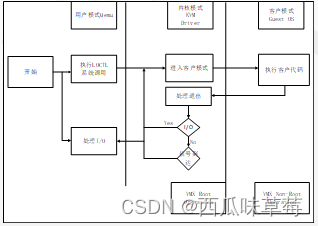 用户模式的qemu利用libkvm通过ioctl进入内核模式,kvm模块为虚拟机创建虚拟内存,虚拟CPU后执行VMLauch指令进入客户模式。加载Guest OS并执行。如果Guest OS 发生外部中断或者影子页表缺页之类的情况,会暂停Guest OS的执行,退出客户模式,执行异常处理,之后重新进入客户模式,执行客户代码。如果发生I/O事件或者信号队列中有信号到达,就会进入用户模式处理。