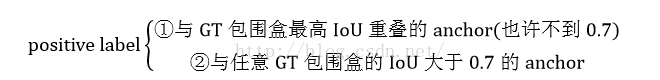 为了训练RPN,需要给每个anchor分配的类标签{目标、非目标}。对于positive label(正标签),论文中给了如下规定(满足以下条件之一即可判为正标签):