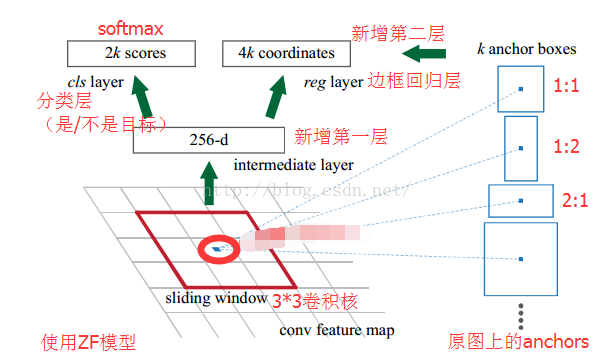对于每一个位置来说,分类层从256维特征中输出属于前景和背景的概率;窗口回归层从256维特征中输出4个平移缩放参数。