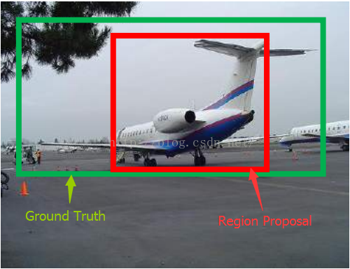 如图10所示,绿色的框为飞机的Ground Truth,红色的框是提取的Region Proposal。那么即便红色的框被分类器识别为飞机,但是由于红色的框定位不准(IoU<0.5),那么这张图相当于没有正确的检测出飞机。如果我们能对红色的框进行微调,使得经过微调后的窗口跟Ground Truth更接近,这样岂不是定位会更准确。确实,Bounding-box regression 就是用来微调这个窗口的。