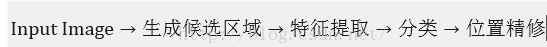 R-CNN (Region-based Convolutional Neural Networks) | 1、SS提取RP; 2、CNN提取特征; 3、SVM分类; 4、BB盒回归。 | 1、 训练步骤繁琐(微调网络+训练SVM+训练bbox); 2、 训练、测试均速度慢 ; 3、 训练占空间 | 1、 从DPM HSC的34.3%直接提升到了66%(mAP); 2、 引入RP+CNN |