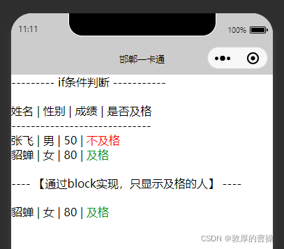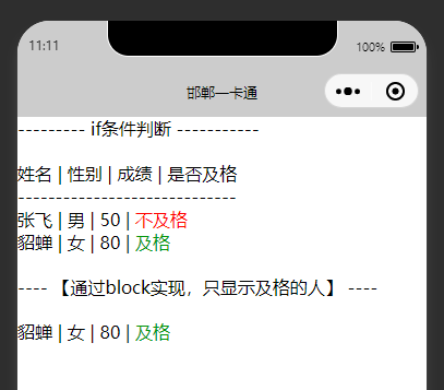 <view style="padding-bottom: 20px;">---- 【通过block实现,只显示及格的人】 ----</view>