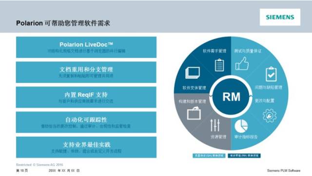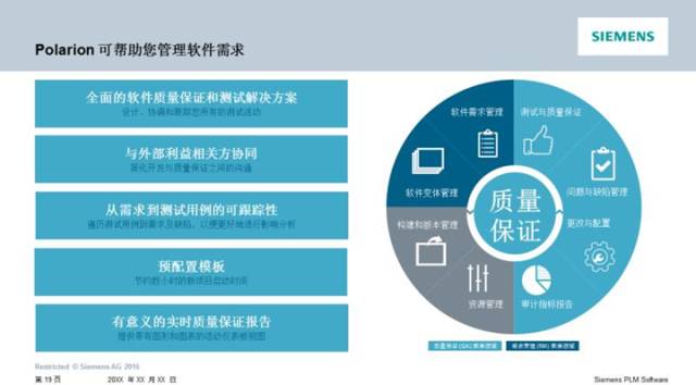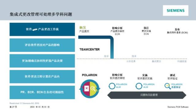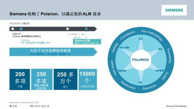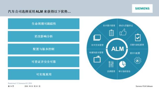给大家介绍Polarion的一些主要功能,但是对我们汽车客户来说的话,我们软件只是我们的一部分,我们还有ECU还有我们的控制系统,那这样的话,它的一些开发流程和数据需要在哪管理呢,为此我们西门子也提供另外一个产品我们叫PLM,产品生命周期管理,通过ALM和PLM的集成来管理产品所有的数据。