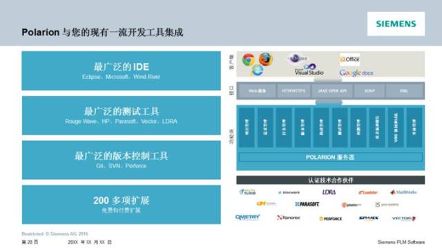 右边的是Polarion的一个基本架构,下边是Polarion支持的一些工具类的集成。Polarion广泛集成一些IDE的工具链是包括自动化测试的一些工具,Polarion底层支持一些最广泛的版本控制工具,包括Git,SVN,Perforce.另外Polarion支量200多个扩展的一个扩展包来支撑我们丰富的功能,这边的话有免费的,有些是付费的,就都是第三方来提供的。