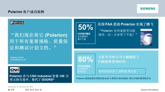 Polarion的客户遍布各个行业包括我们的汽车,航空航天、电子、机械行业等等,这里列出来跟我们汽车相关的客户,phoenix电气公司将Polarion去管理软件开发的管理需求质量和测试。还有美国的FAA它是使用Polarion管理所有的需求。CNH这个是全球比较大的工程机械制造商,它使用了Polarion取代了dos去管理它的需求。飞索半导体使用Polarion去跟踪和管理它的一些需求跟设计。