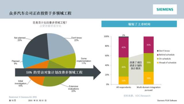 从这个统计可以看出,不光是整车还是零部件企业现在越来越注重机械和硬件开发流程过渡到数字化开发流程,而这个数字化开发流程集成我们的硬件、电子、软件,实际上现在有58%在未来几年都会投资到工程解决方案当中去。