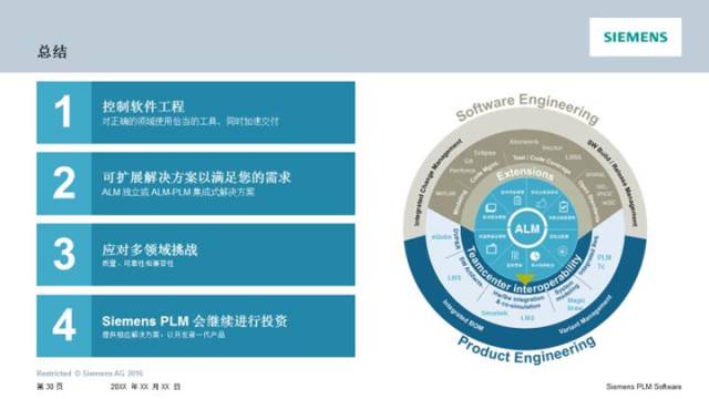 我们小结一下,借助于西门子的产品可以控制和管理我们整个软件工程的活动,通过ALM和PLM的集成支撑我们产品级和软件级的开发,可以管理我们产品和软件开发去管理多领域开发的复杂性。