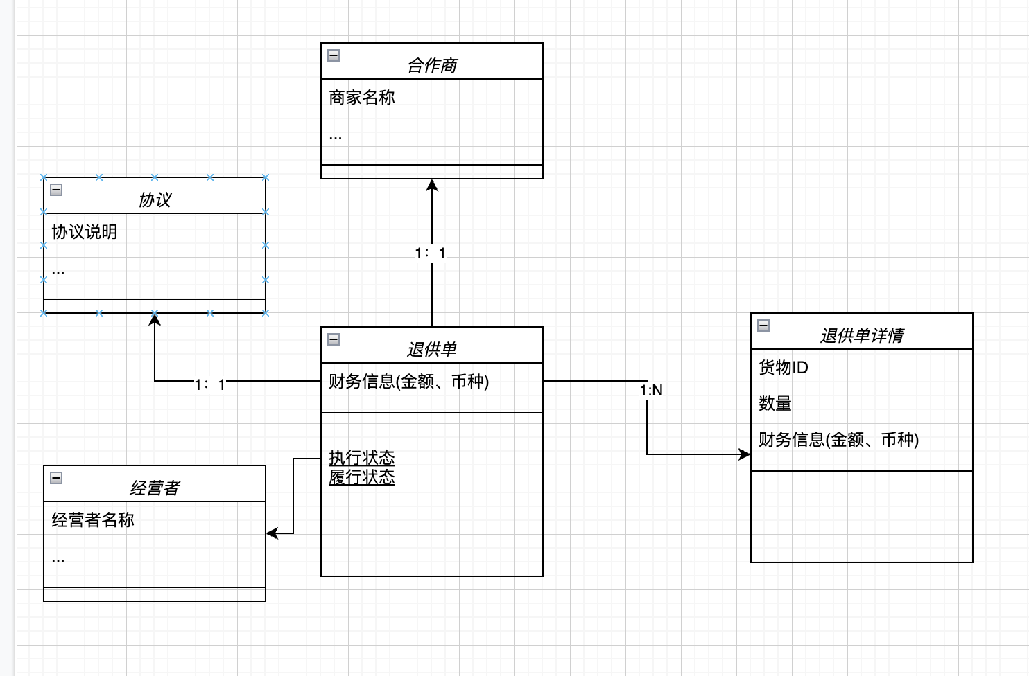 退供单据、经营者、协议(合同)、货物信息(货物ID、数量),外部合作伙伴(供应商,商家)