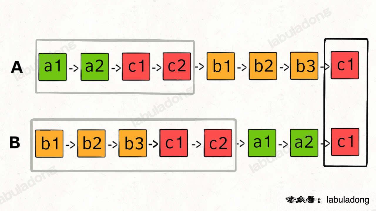 p1和p2同时进入公共部分,也就是同时到达相交节点c1:- 如下参考labuladong老师画的图: