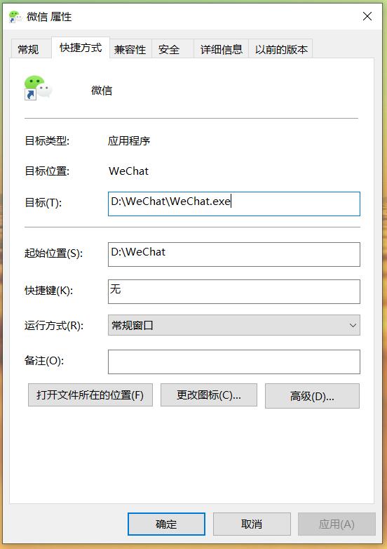2. 右击桌面的微信快捷方式,找到微信的安装路径(即下图“目标”属性中的内容)。