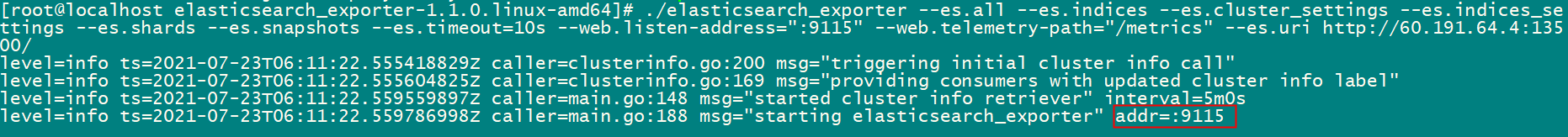 ./elasticsearch_exporter --es.all --es.indices --es.cluster_settings --es.indices_settings --es.shards --es.snapshots --es.timeout=10s --web.listen-address=":9115" --web.telemetry-path="/metrics" --es.uri http://60.191.64.4:13500/