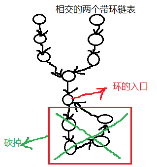 针对带环链表的处理,把环的入口所在节点往后的所有节点全部砍掉,将它退化成相交的两个普通链表就能复用之前的逻辑。