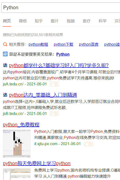 这里最喜欢的功能莫过于去除广告了,大家在使用浏览器的时候肯定都会因为各种各样的广告而烦恼吧,通过这个插件进行搜索之后,由于在搜索过程中做了相关的优化,所以在搜索结果中去除了不少广告的信息,效果如下图还是比较明显的.左图是未使用插件的:前几条内容都是广告信息,右图是使用插件的结果,只看到了第一条广告,对比还是很明显的.