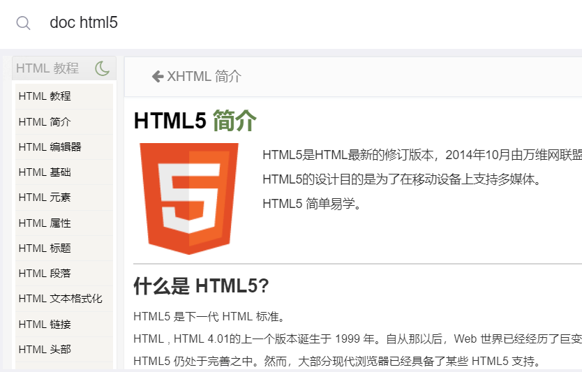 再搜索其中的HTML,就会直接出现如下的教程,这样有什么不会的点就可以直接查看了,无须跳转任何网页,是不是挺方便的,对于程序员来说简直是一大利器.