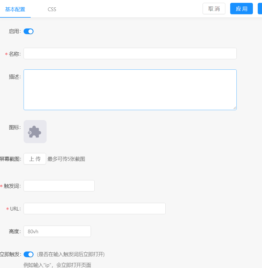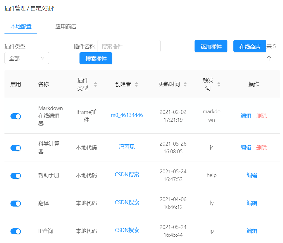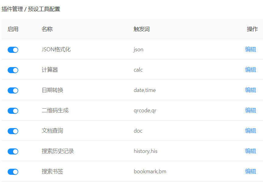 这些功能都是按 C之后在搜索框中输入关键词后可以直接使用的,当然你也可以点击编辑设置自己的触发词,多个可用英文逗号隔开.