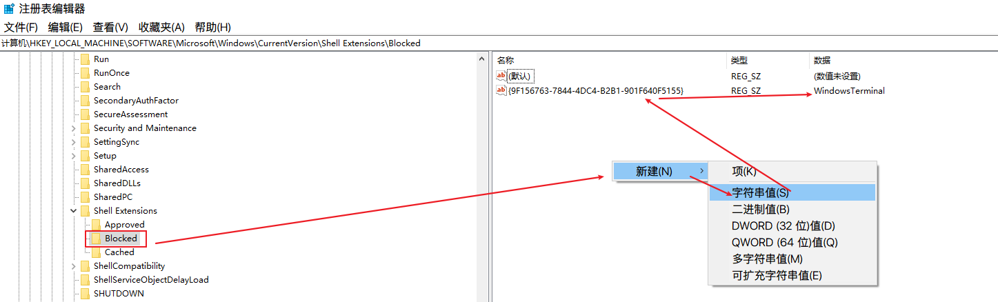 \HKEY_LOCAL_MACHINE\SOFTWARE\Microsoft\Windows\CurrentVersion\Shell Extensions\Blocked(如果Blocked不存在,则需要自己创建) 然后 新增 一个字符串类型的值 键设置为 {9F156763-7844-4DC4-B2B1-901F640F5155} 值设置为 WindowsTerminal