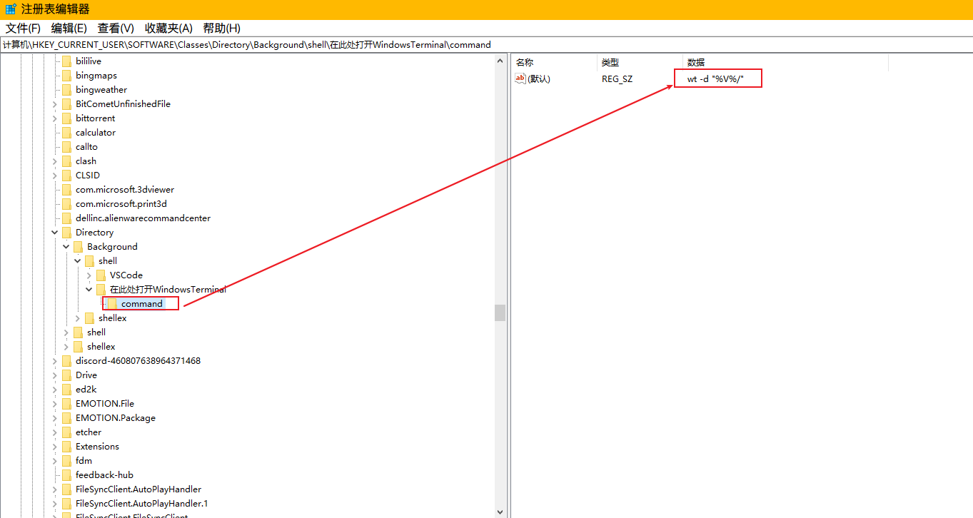 路径 计算机\HKEY_CURRENT_USER\SOFTWARE\Classes\Directory\Background\shell\在此处打开WindowsTerminal\command