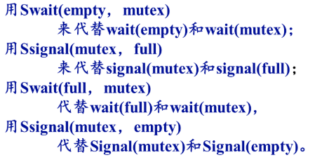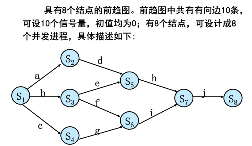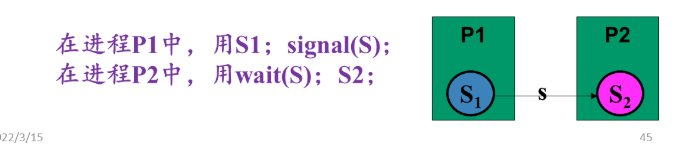 P1中有语句S1; P2中有语句S2。我们希望在S1执行后再执行S2。为实现这种前趋关系,只需使进程P1和P2共享一个公用信号量S,并赋予其初值为0,将signal(S)操作放在语句S1后面,而在S2语 句前面插入wait(S)操作。