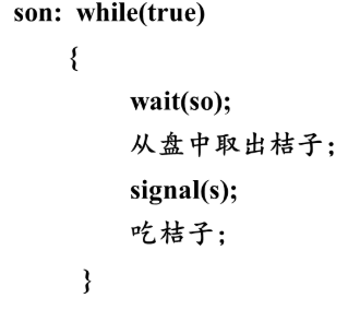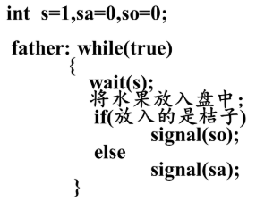 本题中,应设置三个信号量s,so,sa,信号量s表示盘子是否为室,其初值为1,信号量S0表示盘中是否有桔子,其初值为0,信号量sa表示盘中是否有苹果,其初值为0。