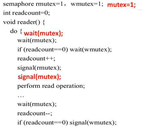 若wait(Wmutex)操作成功,Reader进程便可去读,相应地,做Readcount+1操作。