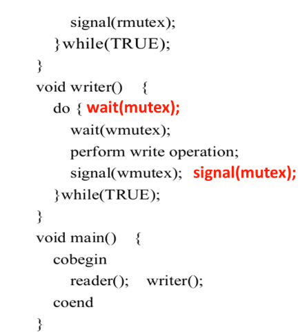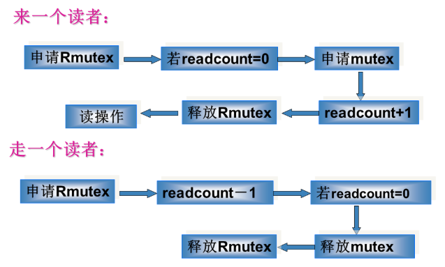 另外,再设置一个整型变量Readcount表示正在读的进程数目。由于只要有一个Reader进程在读,便不允许Writer进程去写。因此,仅当Readcount=0,表示尚无Reader进程在读时,Reader进程才需要执行Wait(Wmutex)操作。