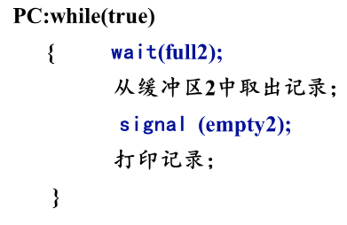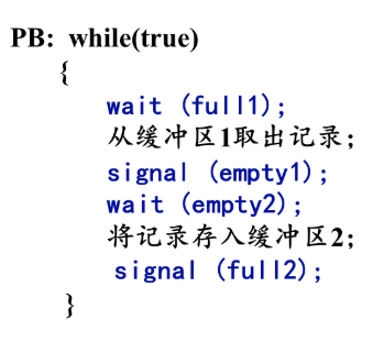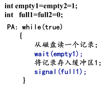 本题中,应设置四个信号量empty1、empty2、full1、full2,信号量empty1和empty2分别表示缓冲区1及缓冲区2是否为空,其初值为1;信号量full1和full2分别表示缓冲区1和缓冲区2是否有记录可供处理,其初值为0。