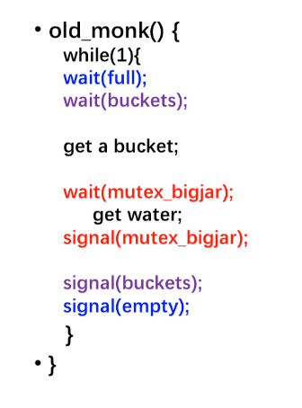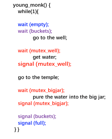 (少林寺问题)某寺庙,有小和尚、老和尚若干.庙内有一水缸,由小和尚提水入缸,供老和尚饮用.水缸可容纳30桶水,每次放水、取水仅为1桶,不可同时进行。水取自同一井中,水井径窄,每次只能容纳一个水桶取水。设水桶个数为5个,试用信号量和wait、signal操 作给出老和尚和小和尚的活动。