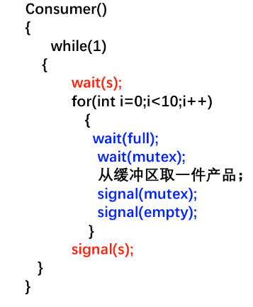 s表示一个消费者进程从缓冲区连续取出10件产品后,其他消费者进程才可以取产品的互斥,初值为1