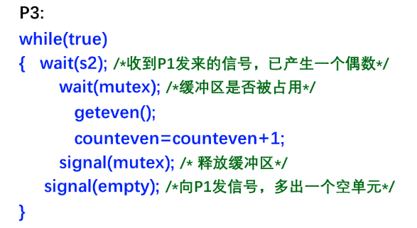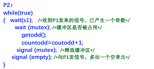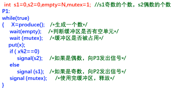 例:三个进程P1、P2、P3互斥使用一个包含N(N>0)个单元的缓冲区。P1每次用produce()生成一个正整数并用put()送入缓冲区某一空单元中;P2每次用getodd()从该缓冲区中取出一个奇数并用countodd统计奇数个数;P3每次用geteven()从该缓冲区中取出一个偶数并counteven统计偶数个数。请用信号量机制实现这三个进程的同步与互斥活动,并说明所定义信号量的含义。要求用伪代码描述。