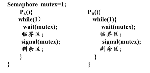 为使多个进程能互斥地访问某临界资源,只需为该资源设置一互斥信号量mutex,设其初始值为1 ,然后将各进程访问该资源的临界区CS置于wait(mutex)和signal(mutex)操作之间即可。
