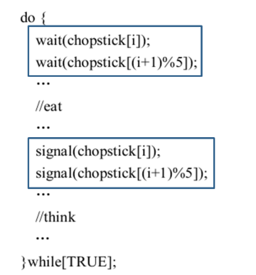 经分析可知,放在桌子上的筷子是临界资源,在.一段时间内只允许一位哲学家使用。为了实现对筷子的互斥使用,可以用一个信号量表示一只筷子,由这五个信号量构成信号量数组。其描述如下:semaphore chopstick[5]={1,1,1,1,1};所有信号量均被初始化为1,第i位哲学家的活动