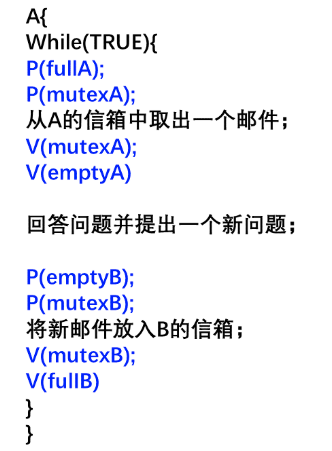 Semaphore mutexA=1; //A信箱放信件与取信件的互斥