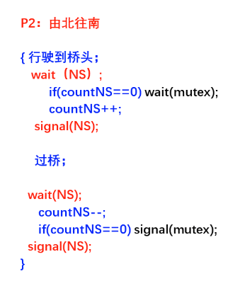 交通问题,车流如箭头所示。桥上不允许两车交会,但允许同方向车辆依次通行(即桥上可以有多个同方向的车)。用wait、signal操作实现交通管理以防止桥上堵塞。