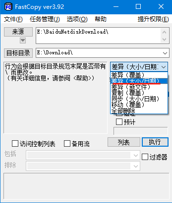 复制默认是:复制(大小/日期),我认为这里是软件翻译的事,应该是复制而不是差异。