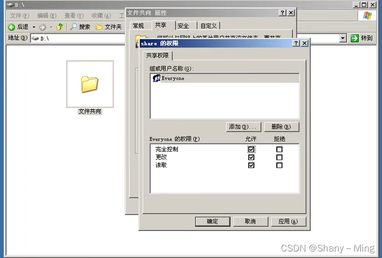 3 )所以建议设置共享权限为everyone完全控制,然后具体的权限需求在NTFS权限中设置即可。