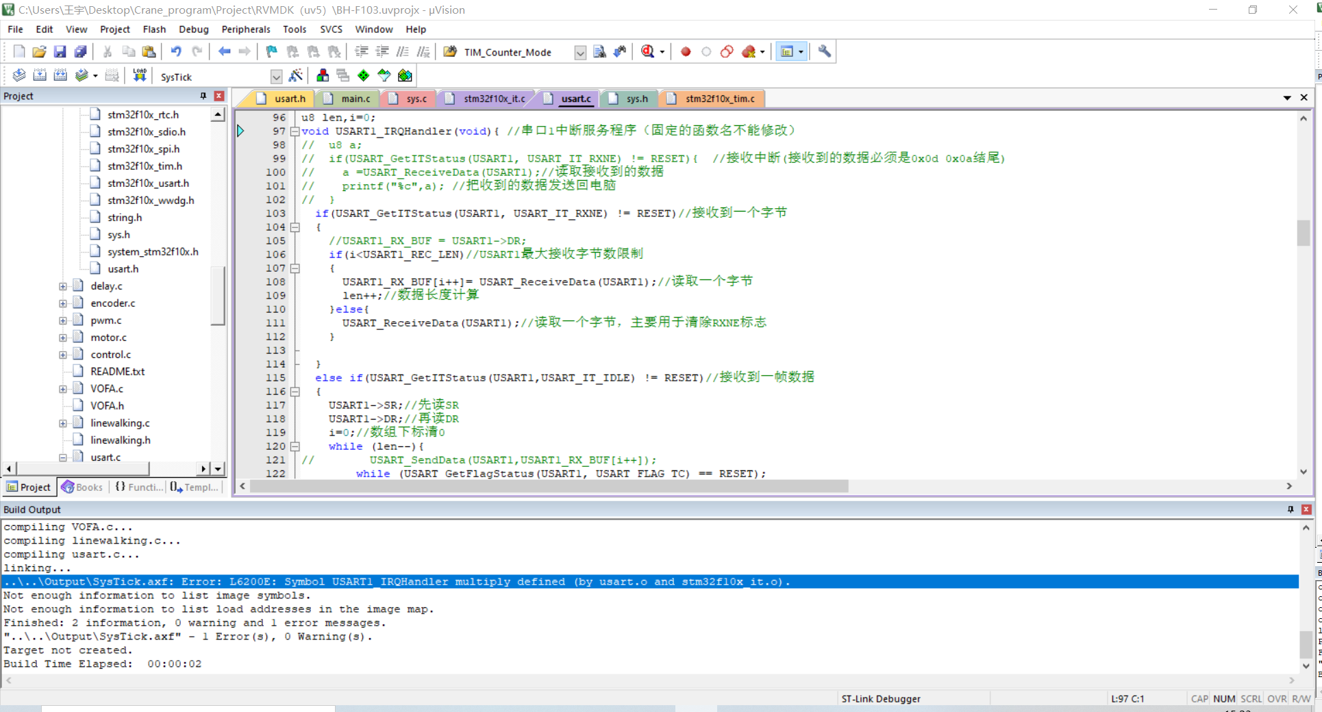 Error: L6200E: Symbol USART1_IRQHandler multiply defined (by usart.o and stm32f10x_it.o).