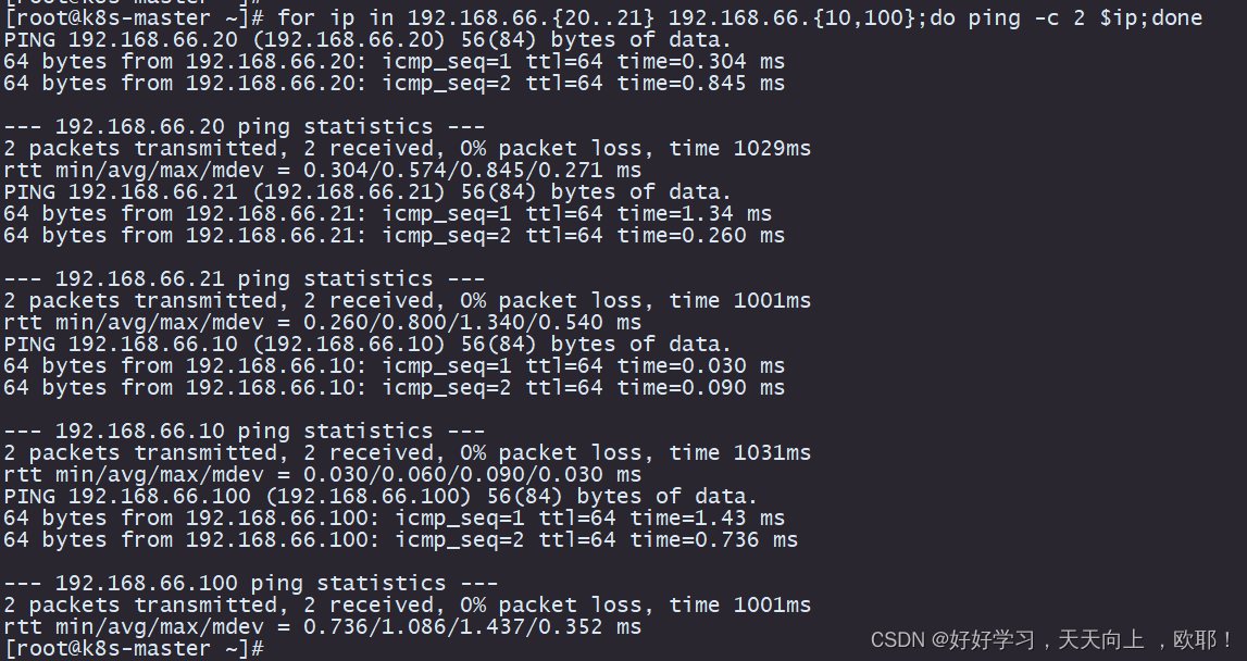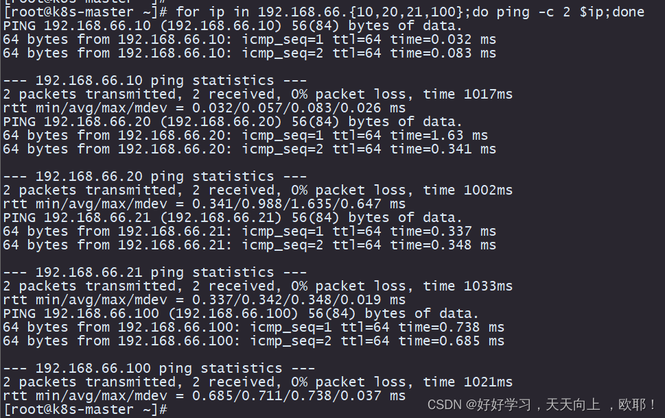 [root@k8s-master ~]# for ip in 192.168.66.{10,20,21,100};do ping -c 2 $ip;done