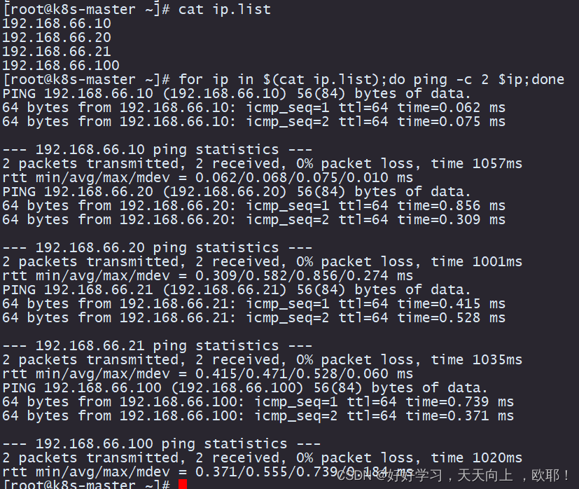 [root@k8s-master ~]# for ip in $(cat ip.list);do ping -c 2 $ip;done