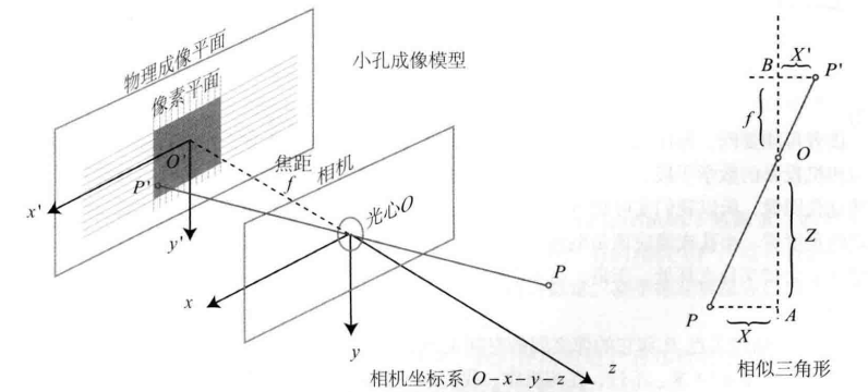 我们中学都做过小孔成像的物理实验,现实的空间点经过小孔投影后,在平面上会成一个倒立的像。而且实际点到光轴的距离X,与图像上对应点到中心的距离X’,其比值与实际点到小孔的垂直距离以及焦距有关。