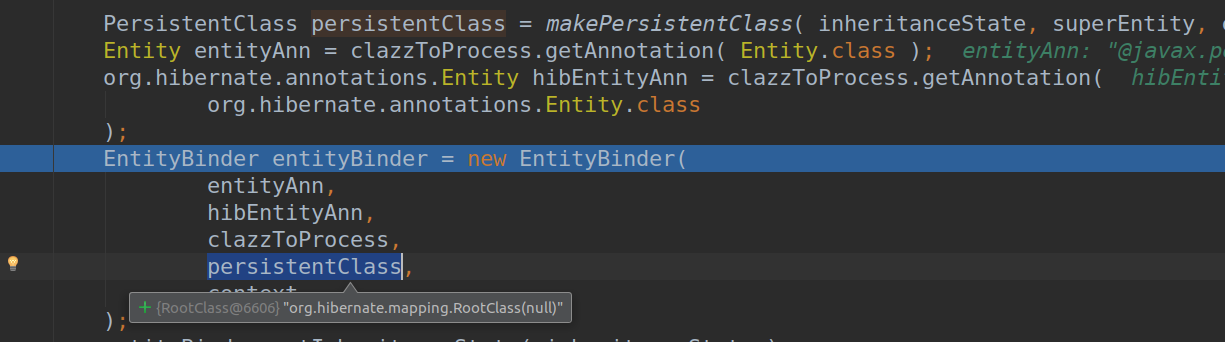 先看下这代码入口:在AnnotationBinder.java的bindClass方法上,关注点在persistenClass变量上,这里将要处理为类就是我定义的这个实体类