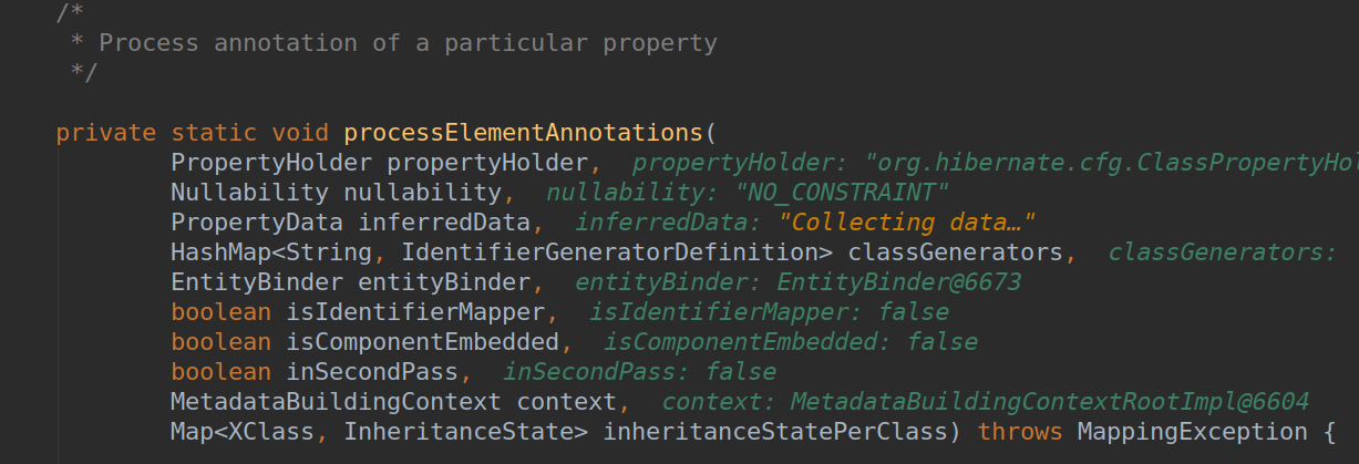 中间过程这里不多说,接下来要处理实体类字段注解,会走到这里:在AnnotationBinder.java类里,会解析字段上的各种注解,