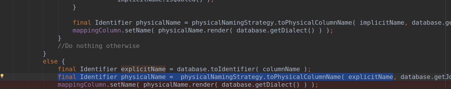 如果没有使用@Column注解指定,就是else上面使用的那个隐式命名:implicitName,都没有区别,重要是这个命名策略的转换过程,这个physicalNamingStrategy,这里默认的是SpringPhysicalNamingStrategy,看下这个实现,我加上了注释: