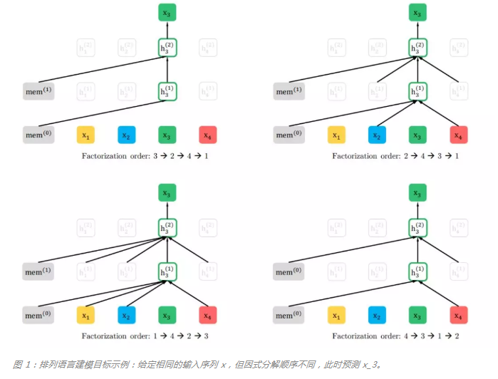 为了提供一个完整的概览图,研究者展示了一个在给定相同输入序列 x(但因式分解顺序不同)时预测 token x_3 的示例,如下图所示:比如图的左上,对应的分解方式是3→2→4→13→2→4→1,因此预测x3x3是不能attend to任何其它词,只能根据之前的隐状态memmem来预测。而对于左下,x3x3可以attend to其它3个词。