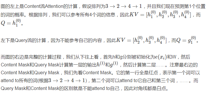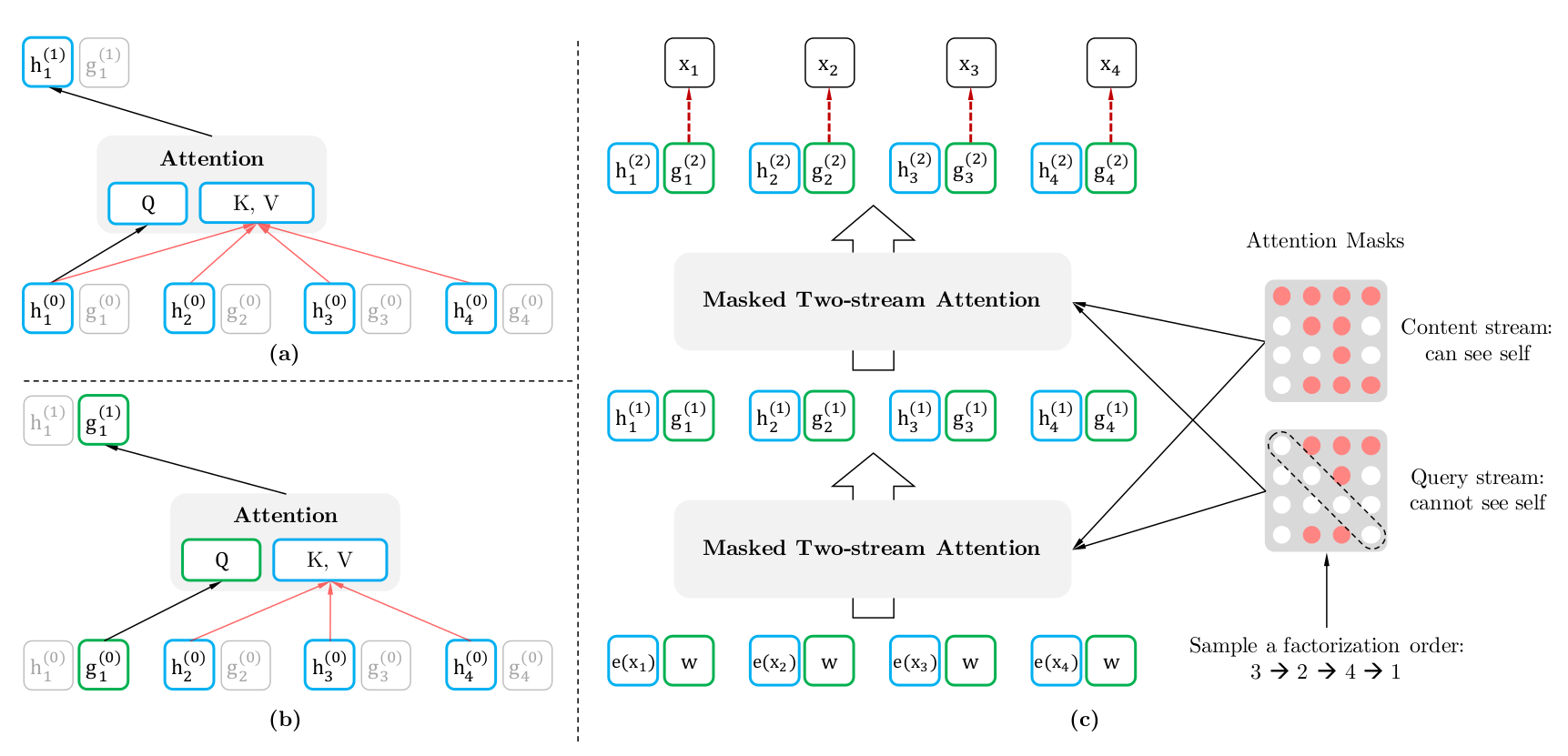 一个很自然的想法就是同时计算两套表征,这便是 XLNet 提出的双通道自注意力 (Two Stream Self-Attention),同时计算内容表征通道 (Content Stream) h 和语境表征通道 (Query Stream) g。注意这里采用的是意译而不是直译,请读者谅解。